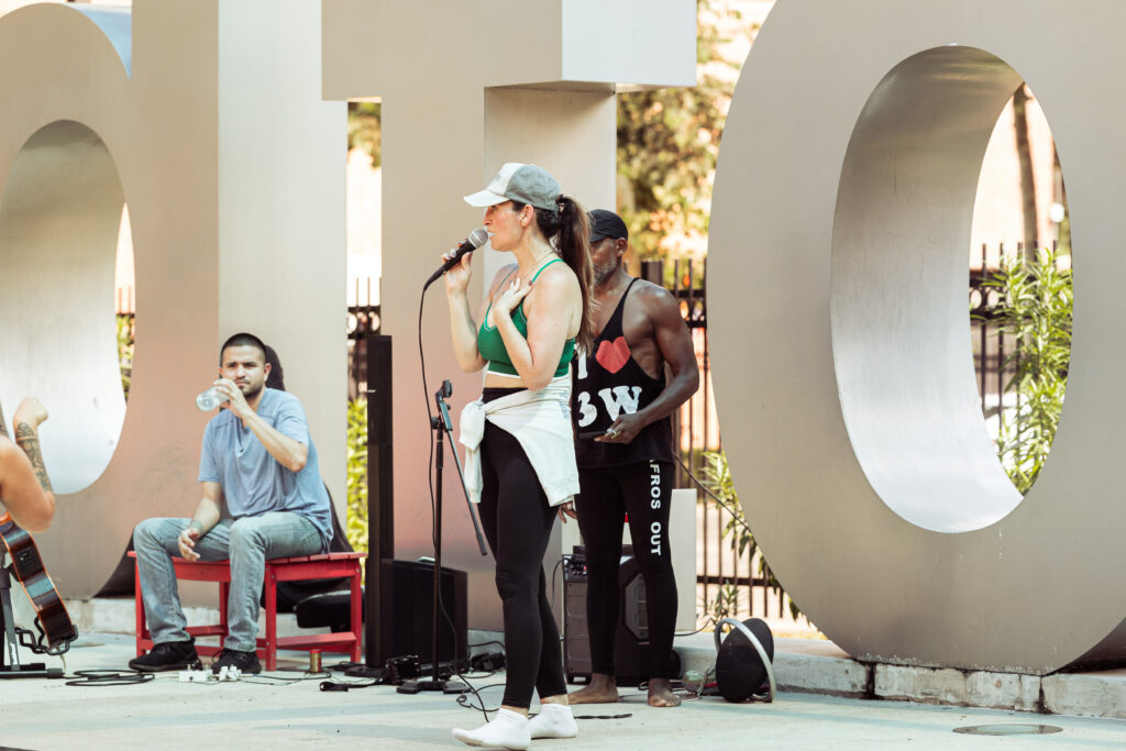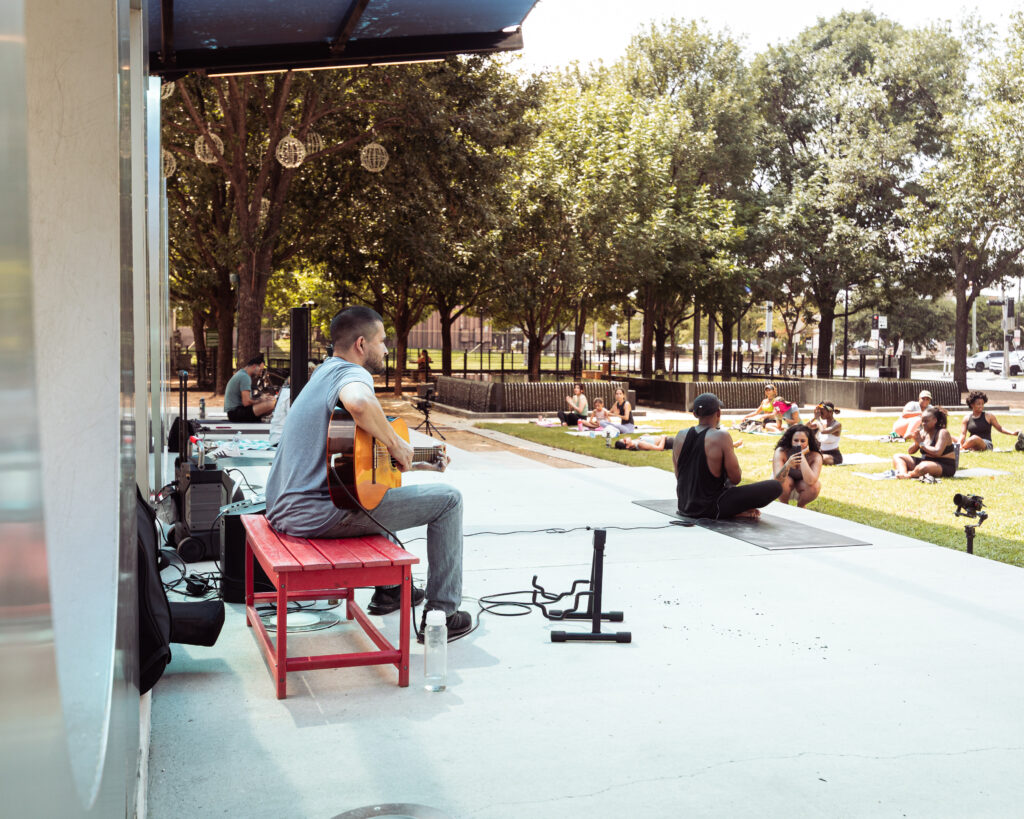 Set to the sounds of live acoustic music, the event transformed Bagby Park into a living canvas of movement and reflection. Guided by Hall and a team of collaborators from By Way of Valor and Yoga Home HTX, attendees explored the idea of “home” through breath, intention, and community connection. Each pose mirrored the architectural flow of Hall’s larger work for HueMan:Shelter, an underpass installation that transforms the Spur 527 and Milam intersection into a sanctuary of color, light, and humanity.